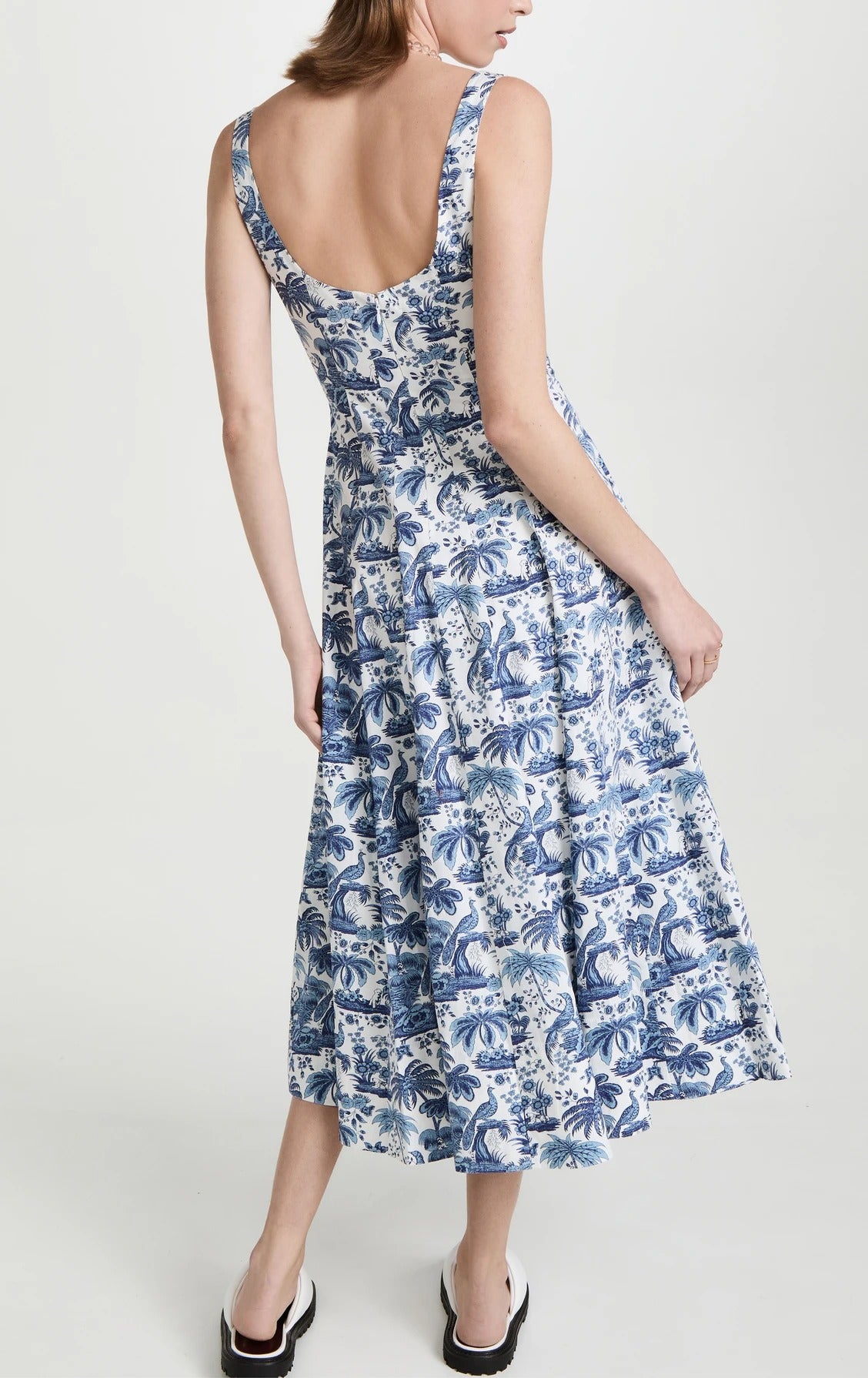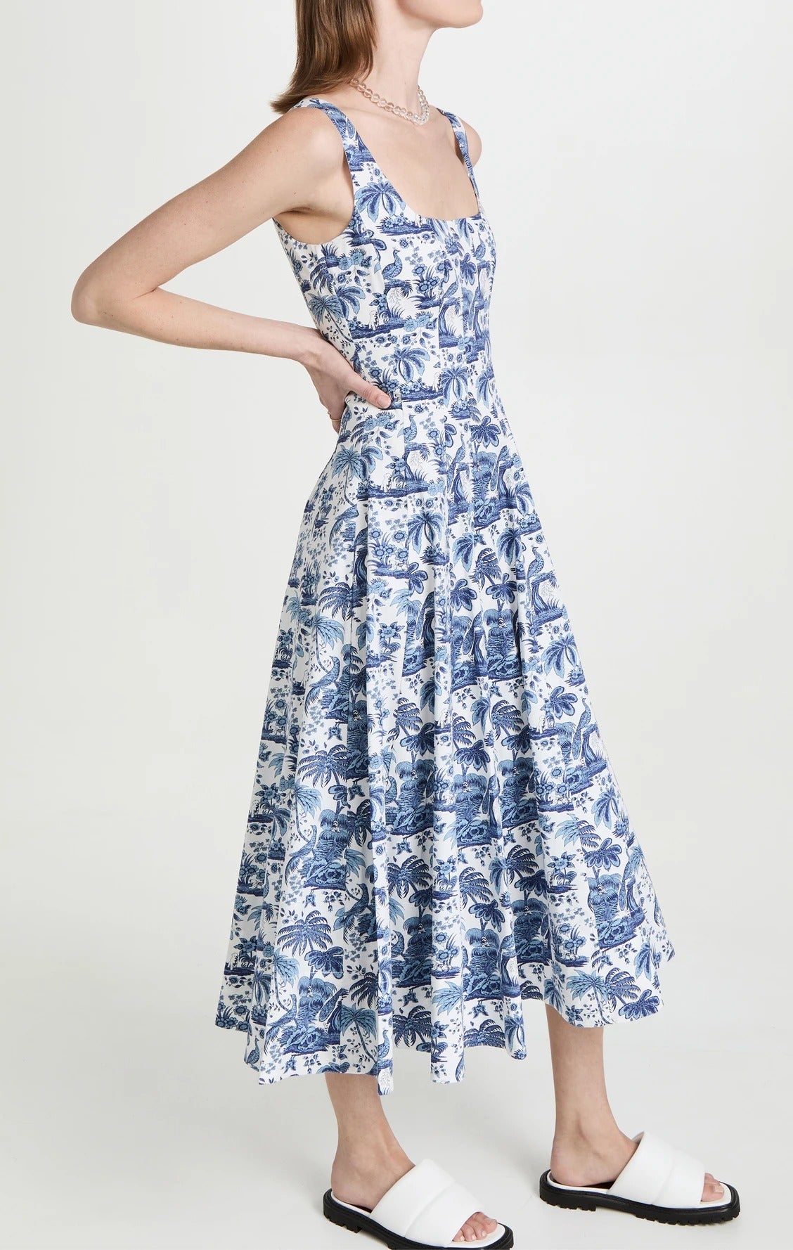 Ta damska sukienka bez rękawów została wykonana z lekkiej, tkanej tkaniny i ma dopasowaną górę oraz rozszerzaną spódnicę. Model posiada szerokie ramiączka oraz prosty, otwarty dekolt. Sukienka wyróżnia się nadrukiem na całej powierzchni w kontrastujących kolorach, który nadaje jej wyrazisty charakter.