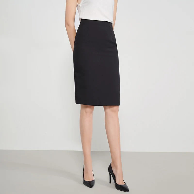 Ta damska spódnica została wykonana z gładkiej, tkanej tkaniny i ma średni stan oraz prosty krój o długości do kolan. Model utrzymany jest w jednolitej kolorystyce i posiada staranne, gładkie wykończenie bez widocznych detali. Spódnica charakteryzuje się minimalistycznym wyglądem i ponadczasową sylwetką.