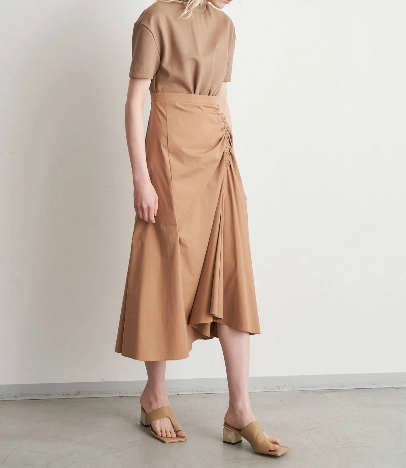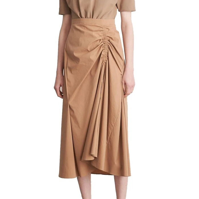 Ta damska spódnica została wykonana z tkanej tkaniny o gładkim wykończeniu i ma średni stan oraz długość midi. Model posiada asymetryczny, plisowany detal z przodu, który nadaje całości warstwowy wygląd. Spódnica utrzymana jest w jednolitej kolorystyce i ma prostą, dopasowaną talię.