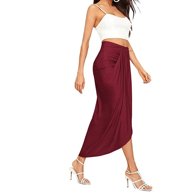 Ta damska spódnica została wykonana z miękko układającej się tkaniny i ma średni stan oraz długi, dopasowany krój. Model posiada drapowany, zachodzący na siebie przód, który tworzy asymetryczny efekt. Spódnica utrzymana jest w jednolitej kolorystyce i ma płynny, elegancki wygląd.