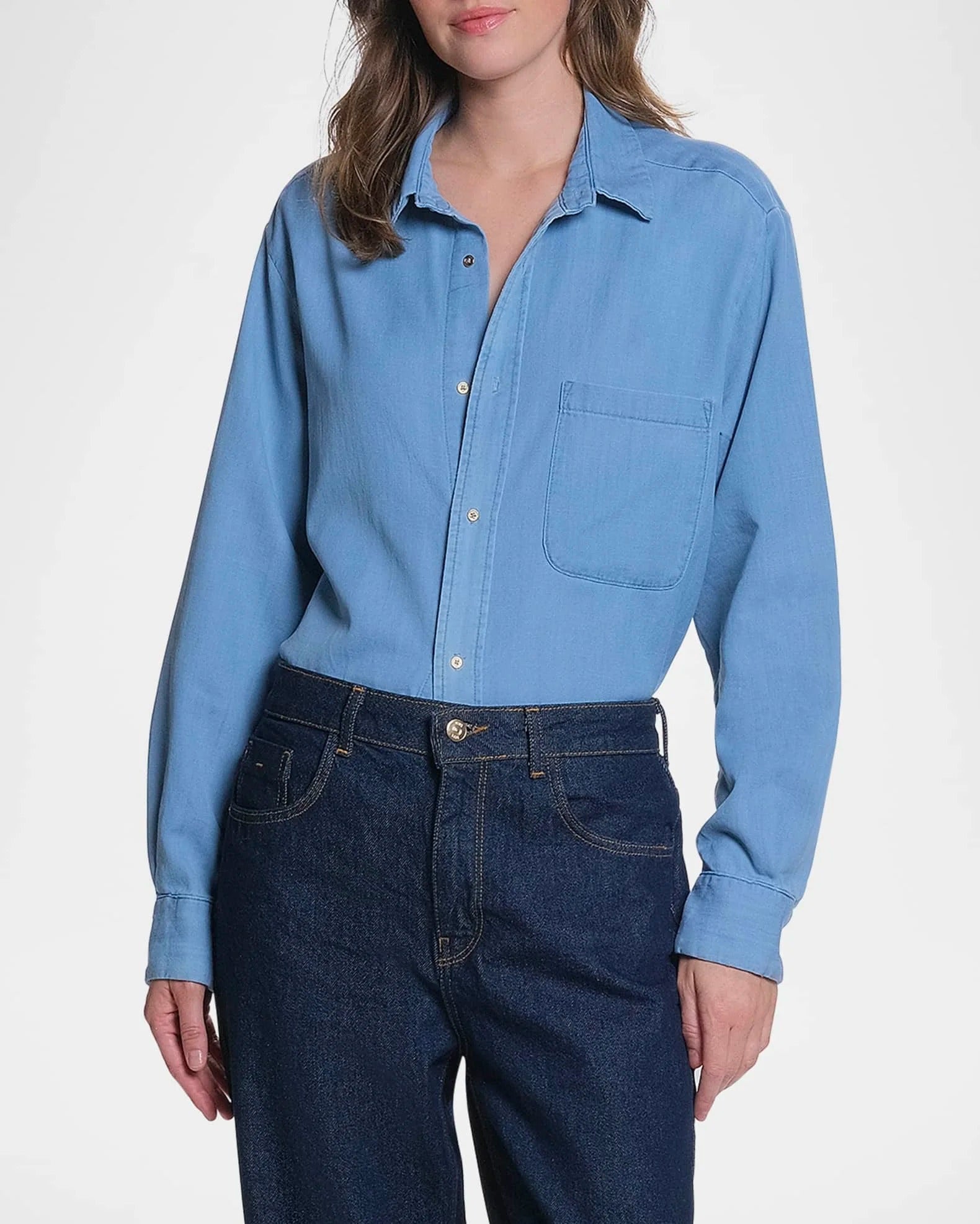 Ta damska bluzka została wykonana z miękko układającej się, tkanej tkaniny i ma prosty do lekko luźnego krój. Model posiada długie rękawy, klasyczny kołnierz oraz zapięcie na guziki z przodu. Na piersi znajduje się naszywana kieszeń, która podkreśla funkcjonalny charakter bluzki.
