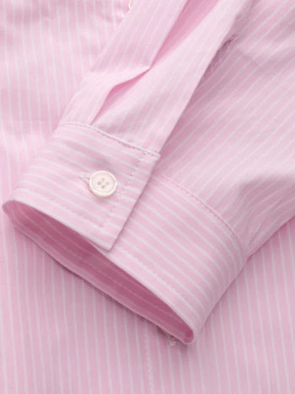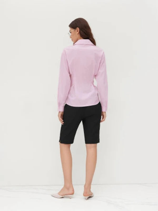 Ta damska bluzka została wykonana z gładkiej, tkanej tkaniny o subtelnej strukturze i ma dopasowany, taliowany krój. Model posiada długie rękawy, klasyczny kołnierz oraz zapięcie na guziki z przodu. Detale w postaci zakładek w talii nadają sylwetce kształt i zapewniają elegancki, schludny wygląd.