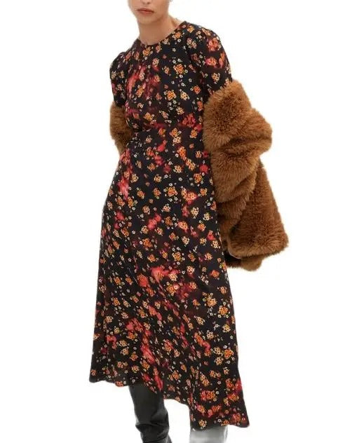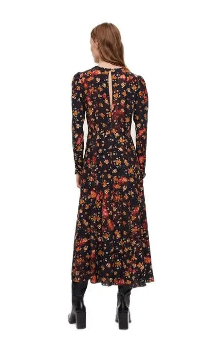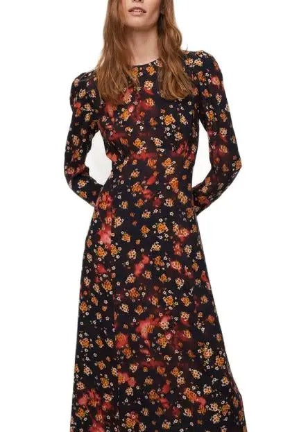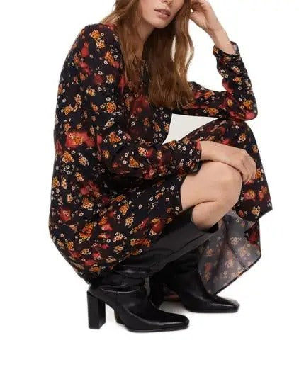 Ta damska sukienka została wykonana z lekkiej, miękko układającej się tkaniny i ma prosty do lekko dopasowanego krój o długiej długości. Model posiada długie rękawy oraz okrągły dekolt. Sukienka wyróżnia się kwiatowym wzorem na całej powierzchni, równomiernie rozmieszczonym.