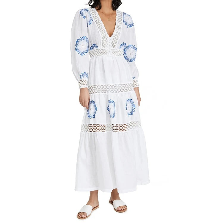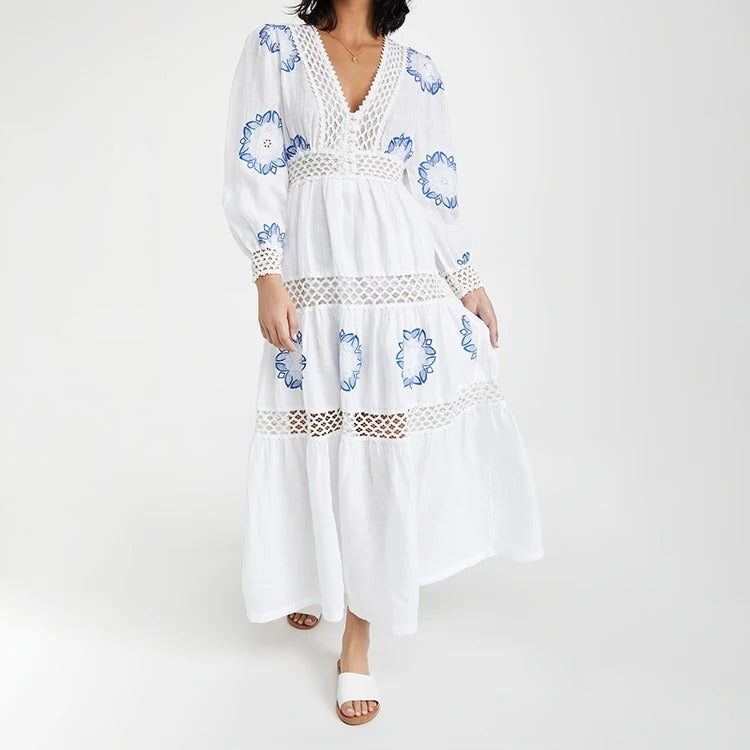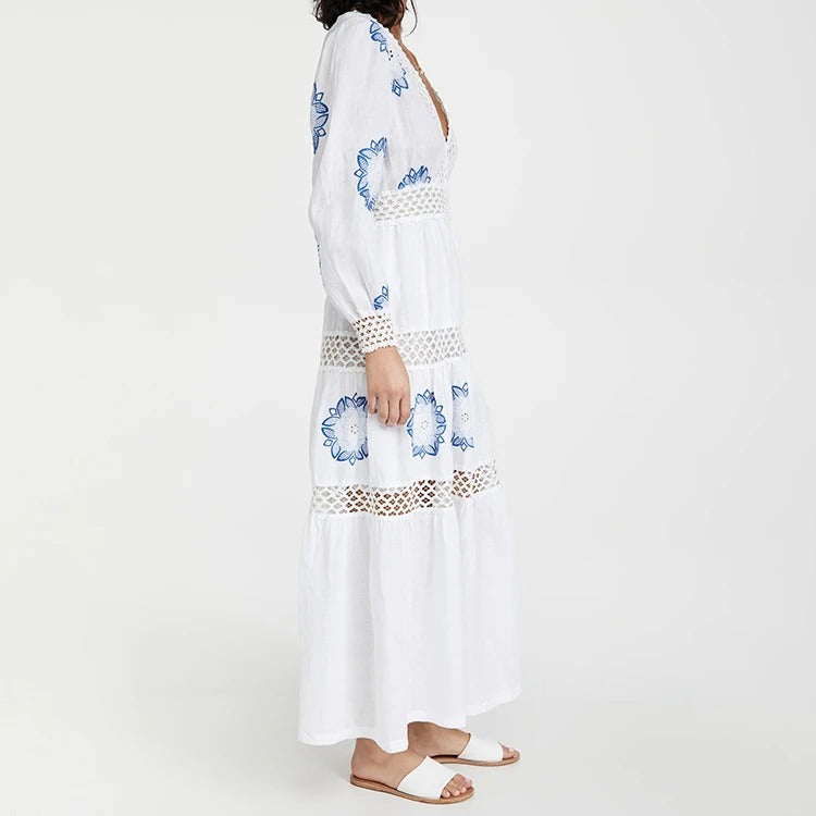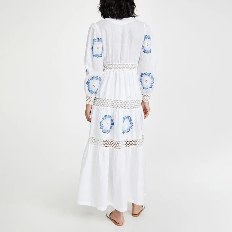 Ta damska sukienka została wykonana z lekkiej, przewiewnej, tkanej tkaniny i ma luźny krój oraz długą długość. Model posiada długie rękawy oraz głęboki dekolt w kształcie litery V, wykończony dekoracyjnymi wstawkami. Sukienka ozdobiona jest haftowanymi motywami oraz ażurowymi detalami, które nadają całości elegancki i subtelny charakter.