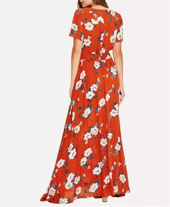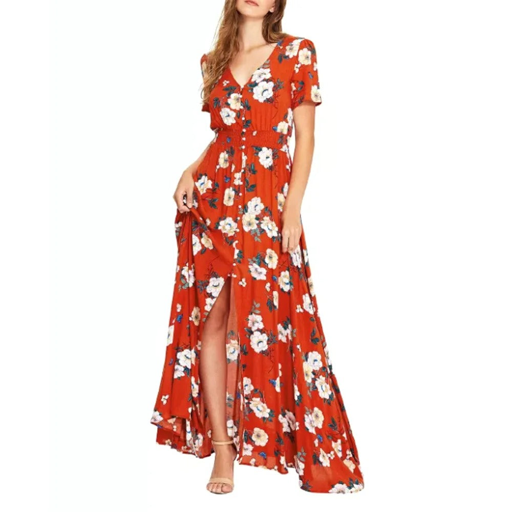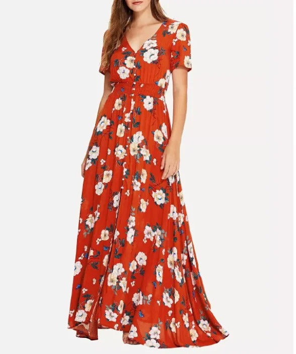 Ta damska sukienka została wykonana z lekkiej, miękko układającej się, tkanej tkaniny i ma dopasowaną górę oraz długą, rozszerzaną spódnicę. Model posiada krótkie rękawy, dekolt w kształcie litery V oraz zapięcie na guziki z przodu. Sukienka wyróżnia się kwiatowym wzorem na całej powierzchni oraz akcentem w talii, który podkreśla kobiecą linię sylwetki.