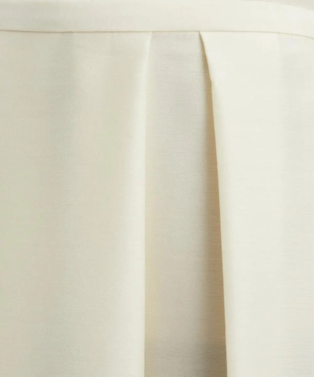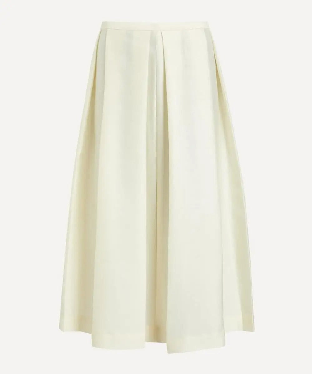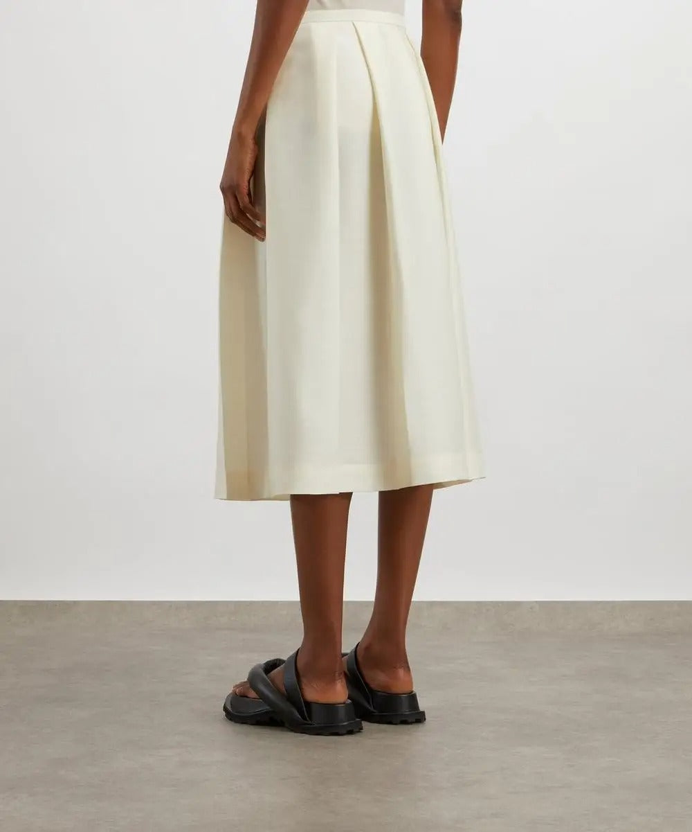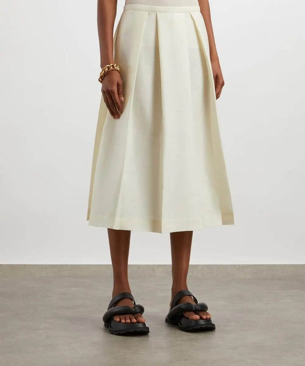 Ta damska spódnica została wykonana z gładkiej, tkanej tkaniny i ma średni stan oraz rozszerzany krój o długości midi. Model posiada zakładki z przodu, które nadają całości uporządkowaną i równomierną formę. Spódnica utrzymana jest w jednolitej kolorystyce i ma staranne wykończenie w pasie.