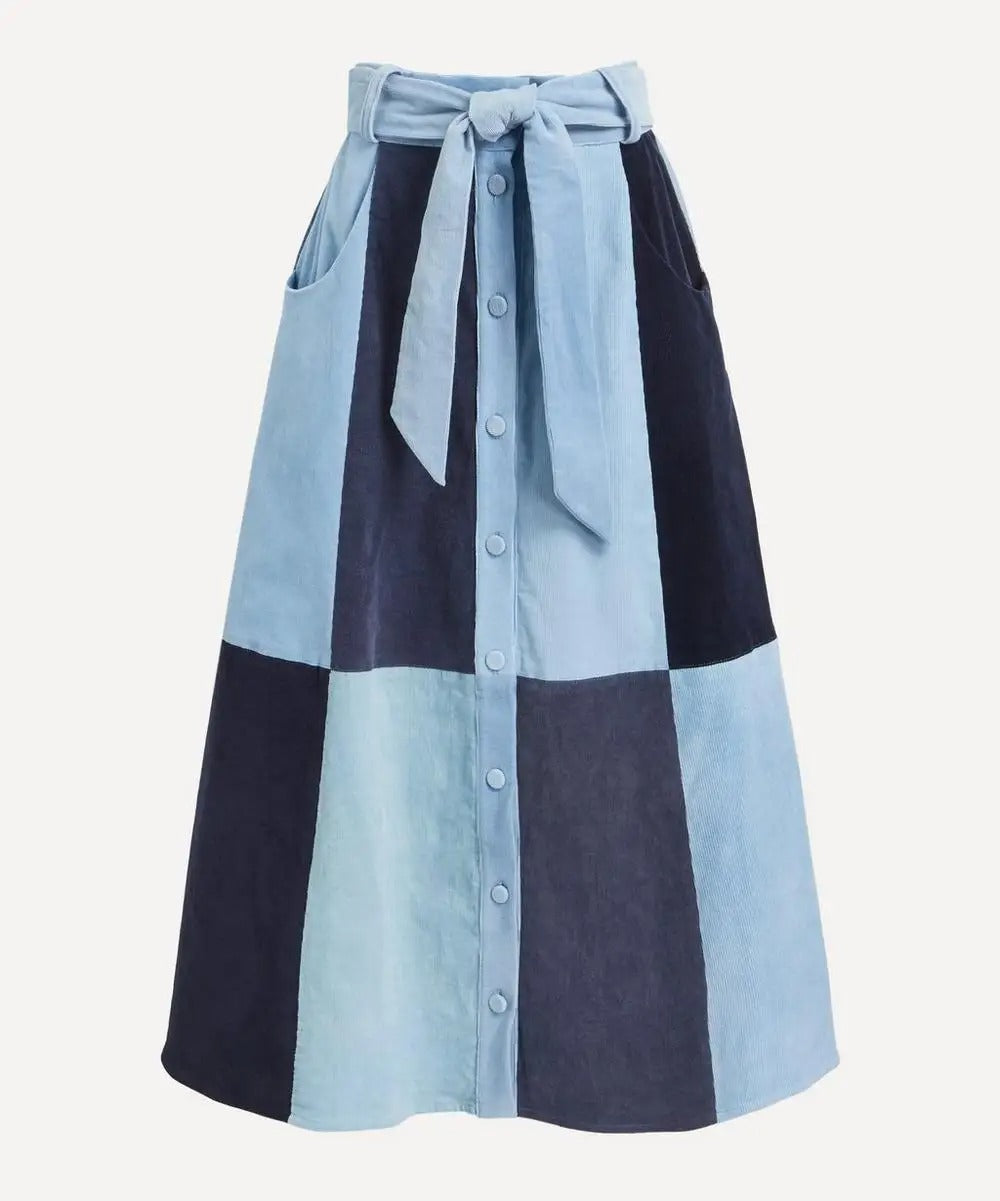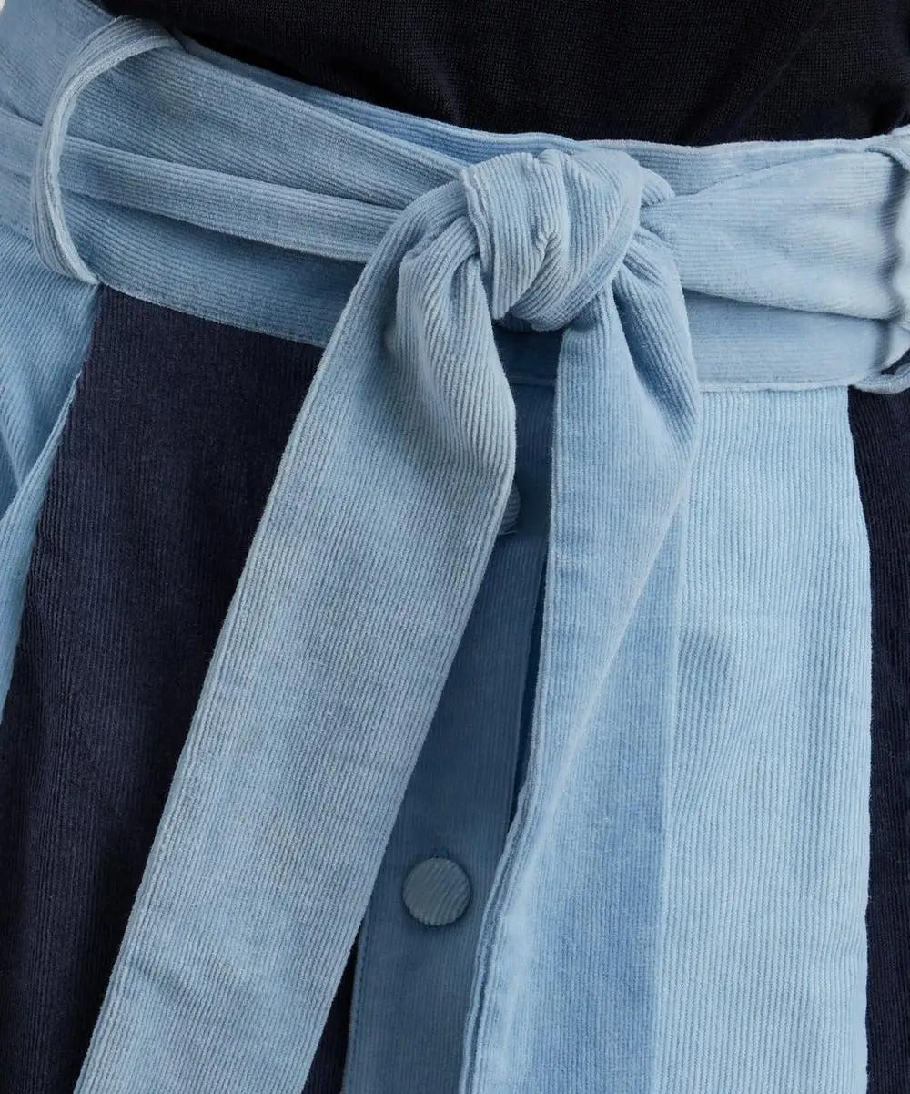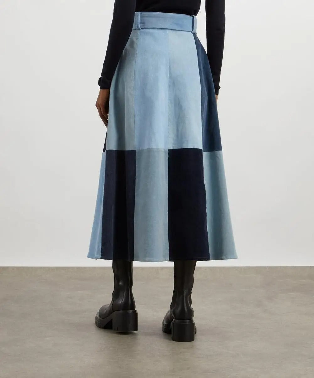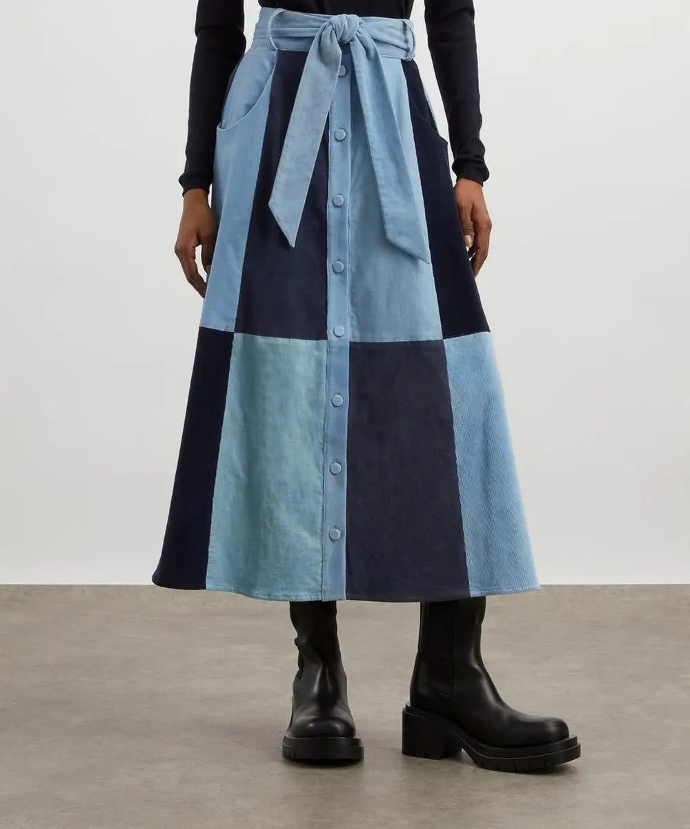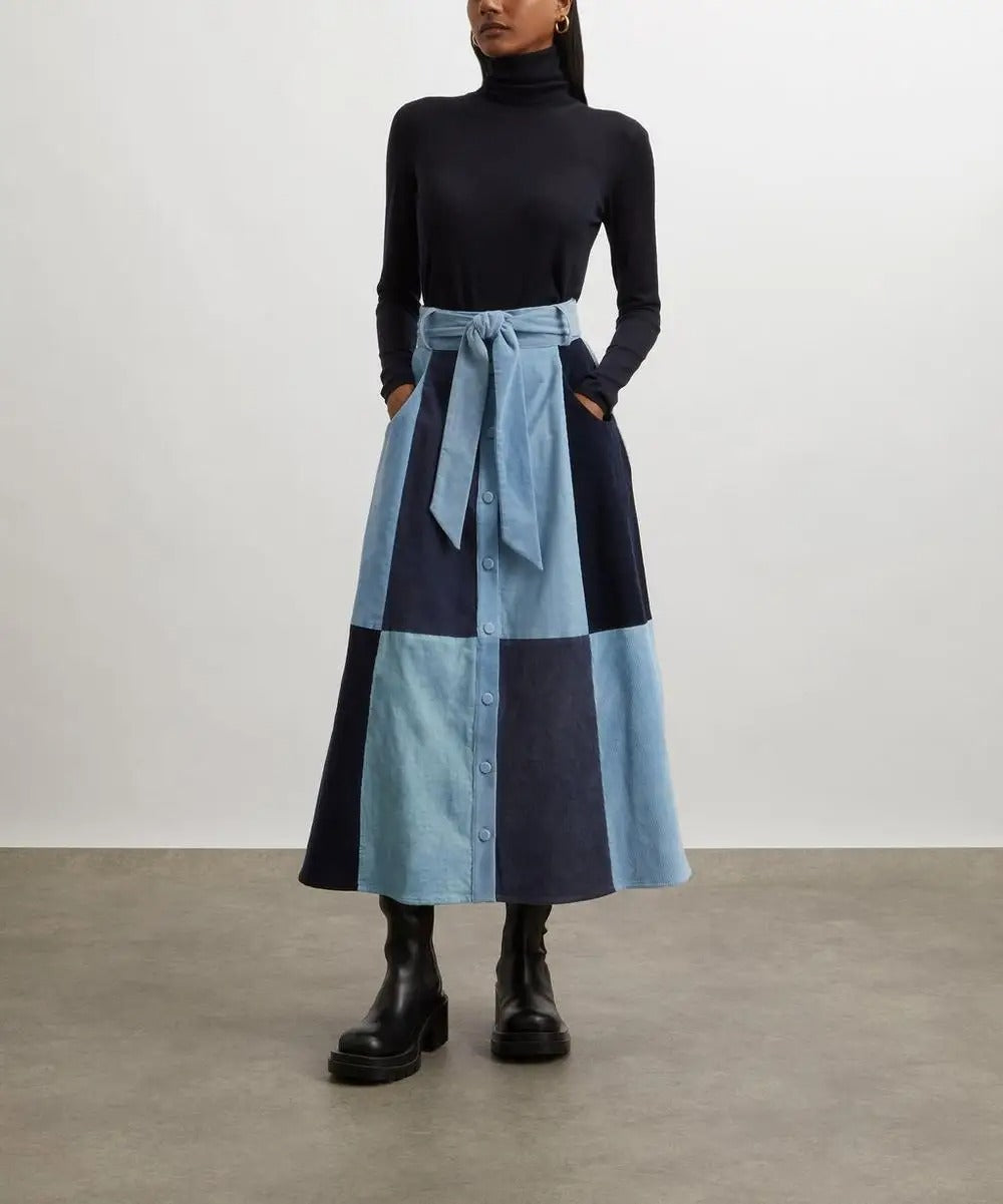 Ta damska spódnica została wykonana z solidnej, tkanej tkaniny i ma średni stan oraz długi, lekko rozszerzany krój. Model posiada zapięcie na guziki z przodu oraz wiązany pasek w talii. Spódnica składa się z kontrastujących fragmentów materiału, które razem tworzą patchworkowy efekt.